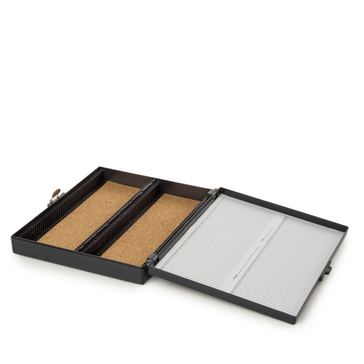 Exceptional slide storage containers providing maximum protection for your microscope slides. The slide box PB.5185 offer a permanent numbered index that corresponds to the numering of the lining in the base